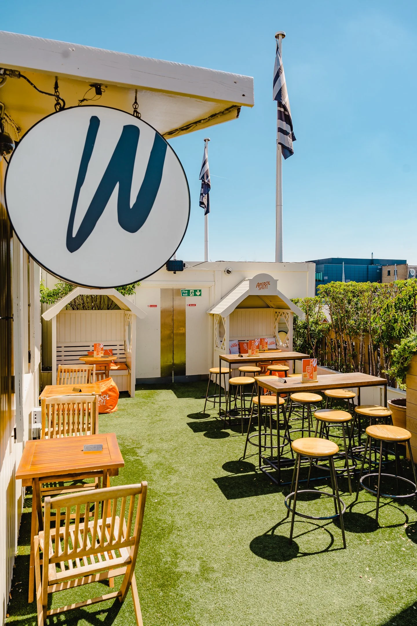 Empty outdoor rooftop bar with wooden tables and stools, some seating areas have umbrellas, green artificial grass flooring, and flags on poles, bright blue sky in the background.